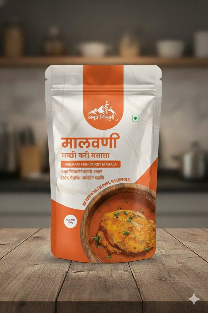 Amrit Girnari Malvani Machi Curry Masala is a traditional Konkan-style spice blend specially crafted for authentic Malvani fish curry. Made using 100% natural spices and prepared by following age-old Malvani methods, this masala brings the true coastal aroma, rich colour from chillies, and perfectly balanced heat to your curry.